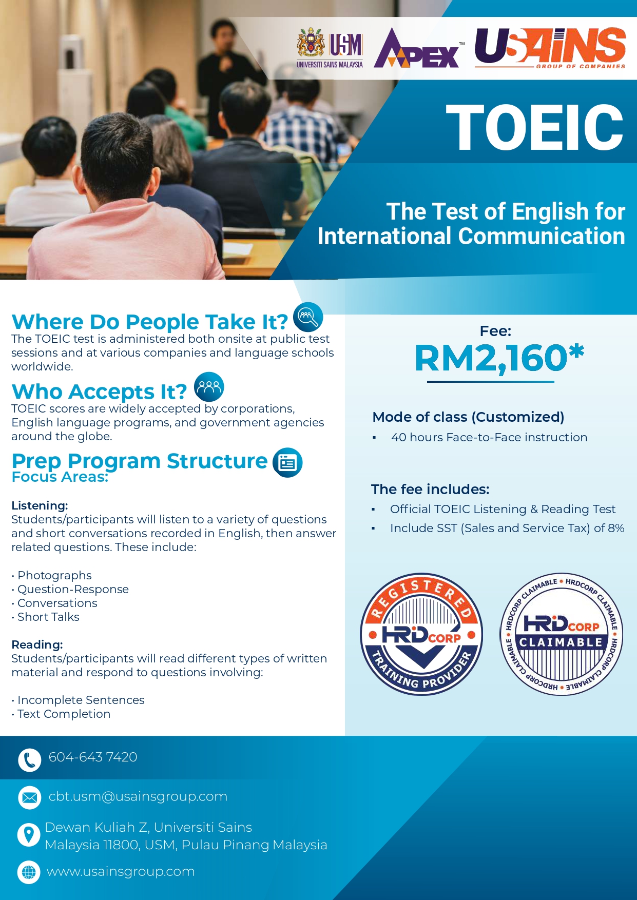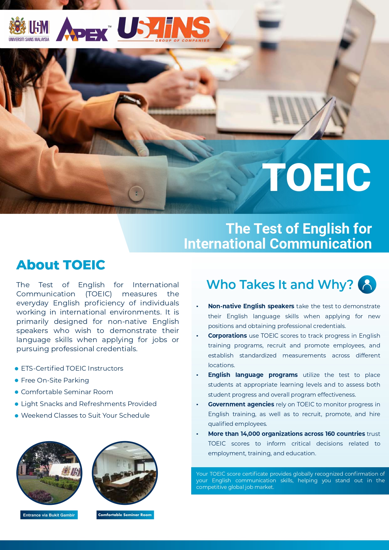 The Test of English for International Communication (TOEIC) determines a person's proficiency in spoken and written English in a global context. Primarily for non-native English speakers to take in order to prove their proficiency in the language when applying for new jobs and acquiring credentials