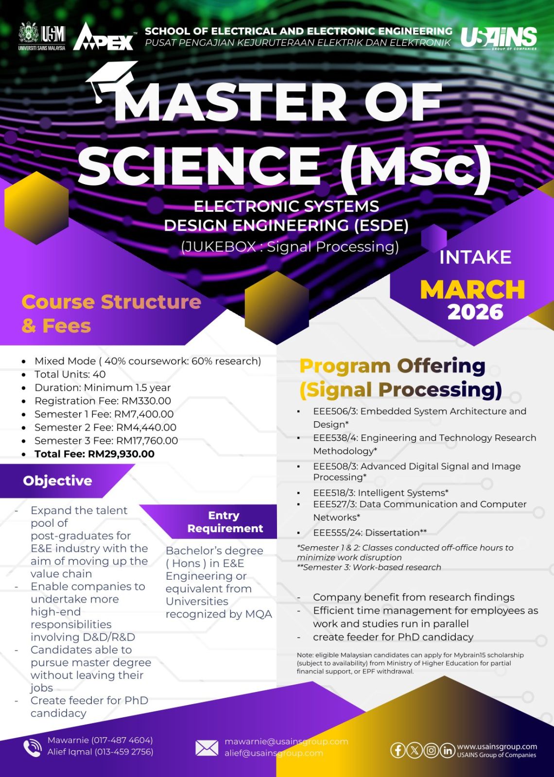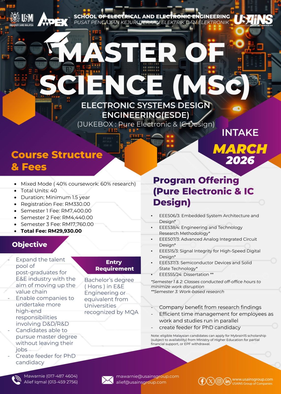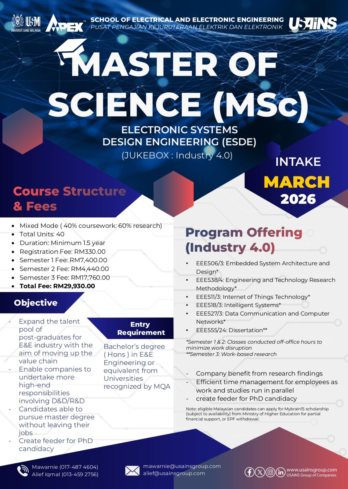 📢 We are excited to announce that the Master of Science Programme (ESDE Jukebox), offered by Universiti Sains Malaysia (USM) in collaboration with USAINS, is now open for registration for the October 2025 intake! 🎓✨