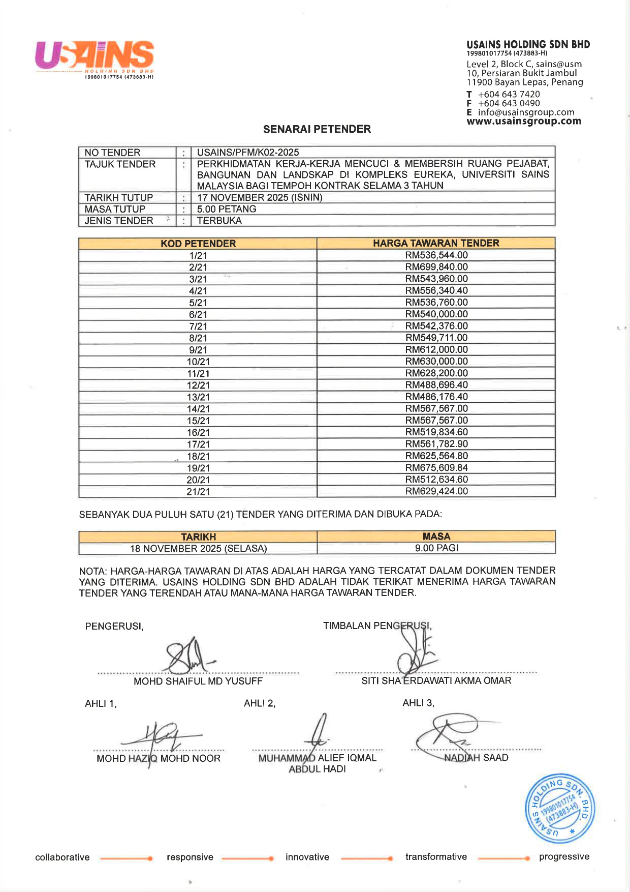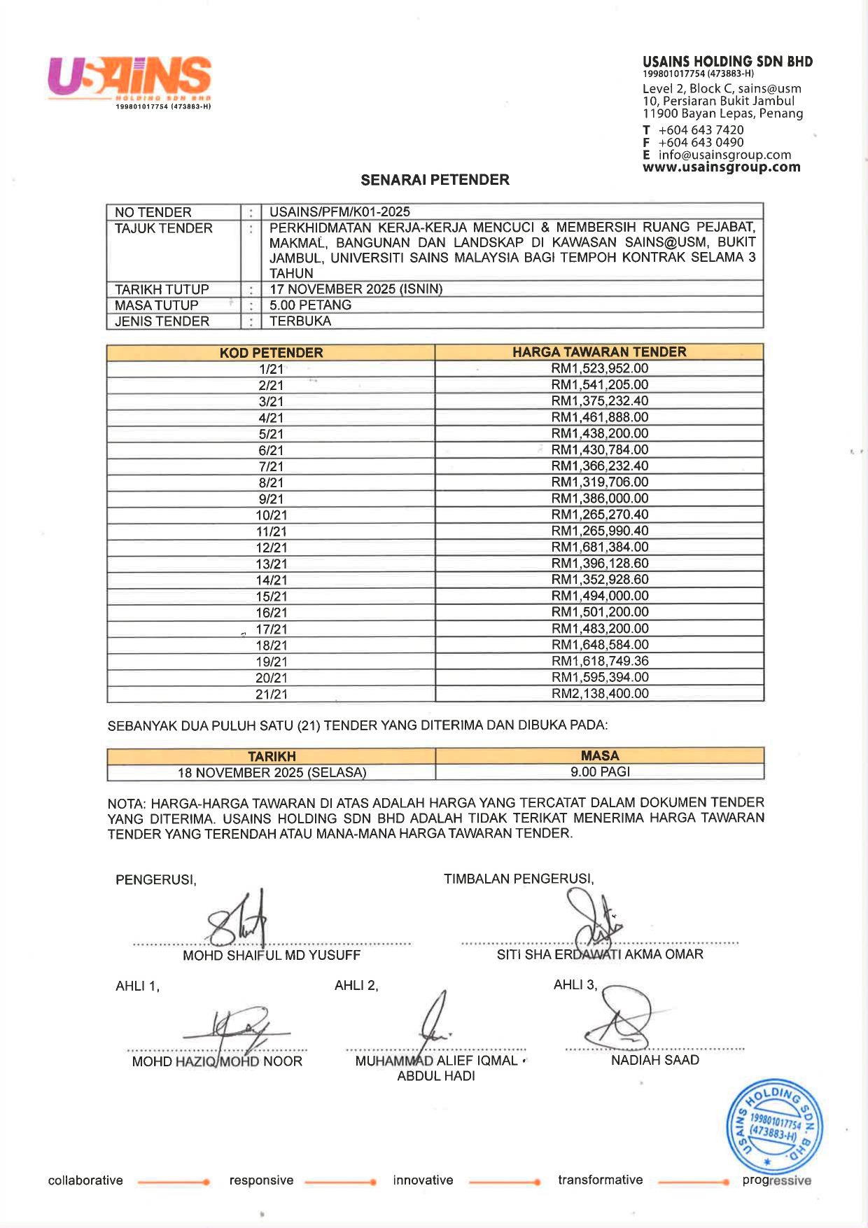 Pengumuman Rasmi: Senarai penuh petender bagiTender Perkhidmatan Kerja-Kerja Mencuci & Membersih Bangunan dan Landskap di Bangunan Seliaan Usains Holding Sdn. Bhd. untuk rujukan umum. Senarai ini merangkumi semua syarikat yang telah menghantar dokumen tender mengikut tarikh dan masa yang ditetapkan.